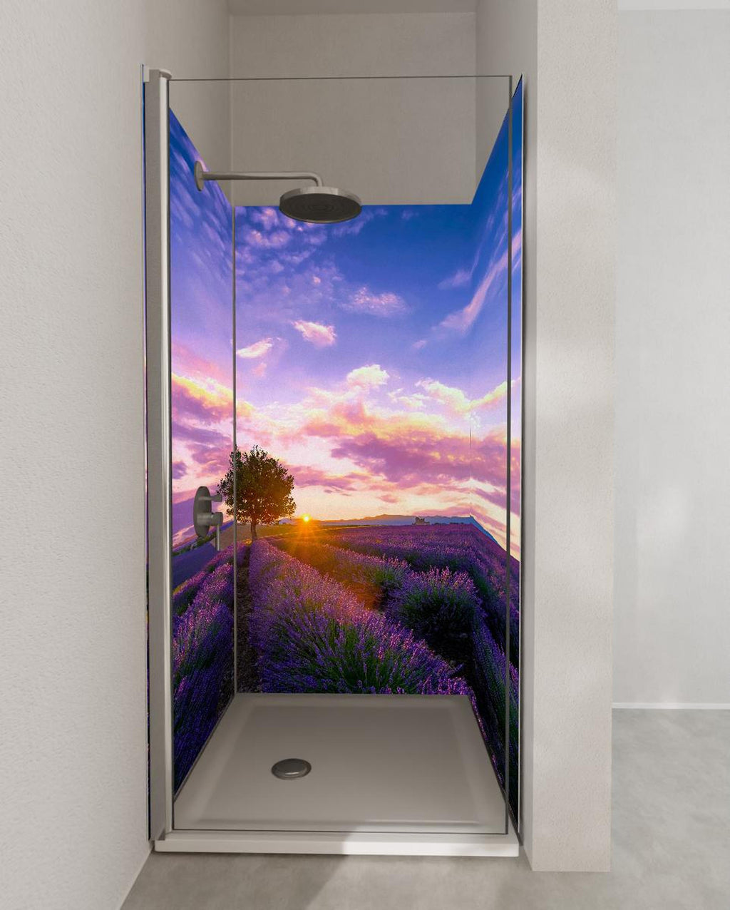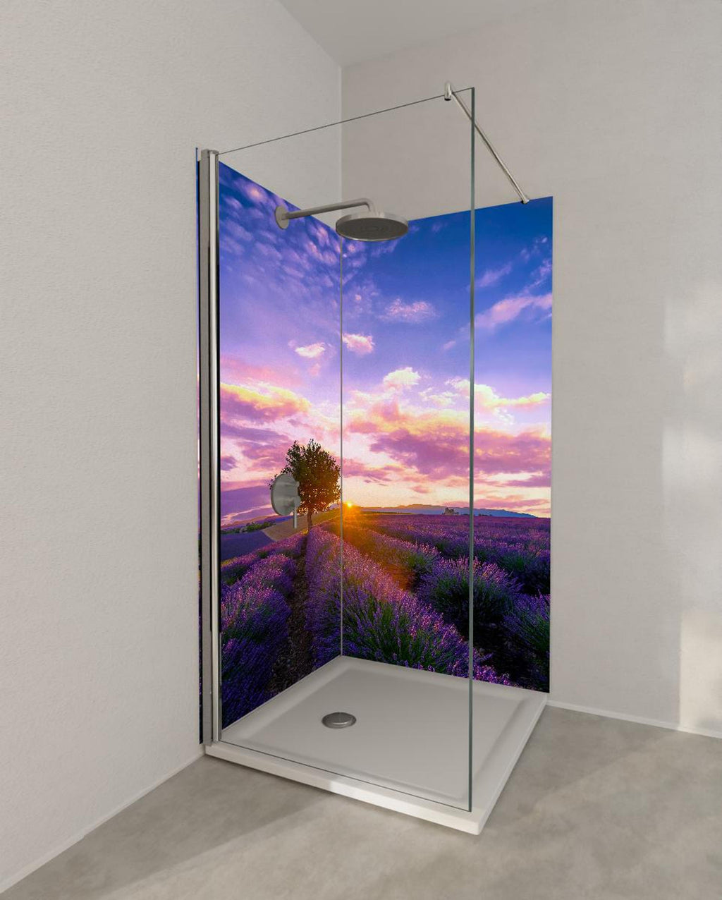 Duschrückwand - Baum im Lavendelfeld bei Sonnenuntergang in der Provence