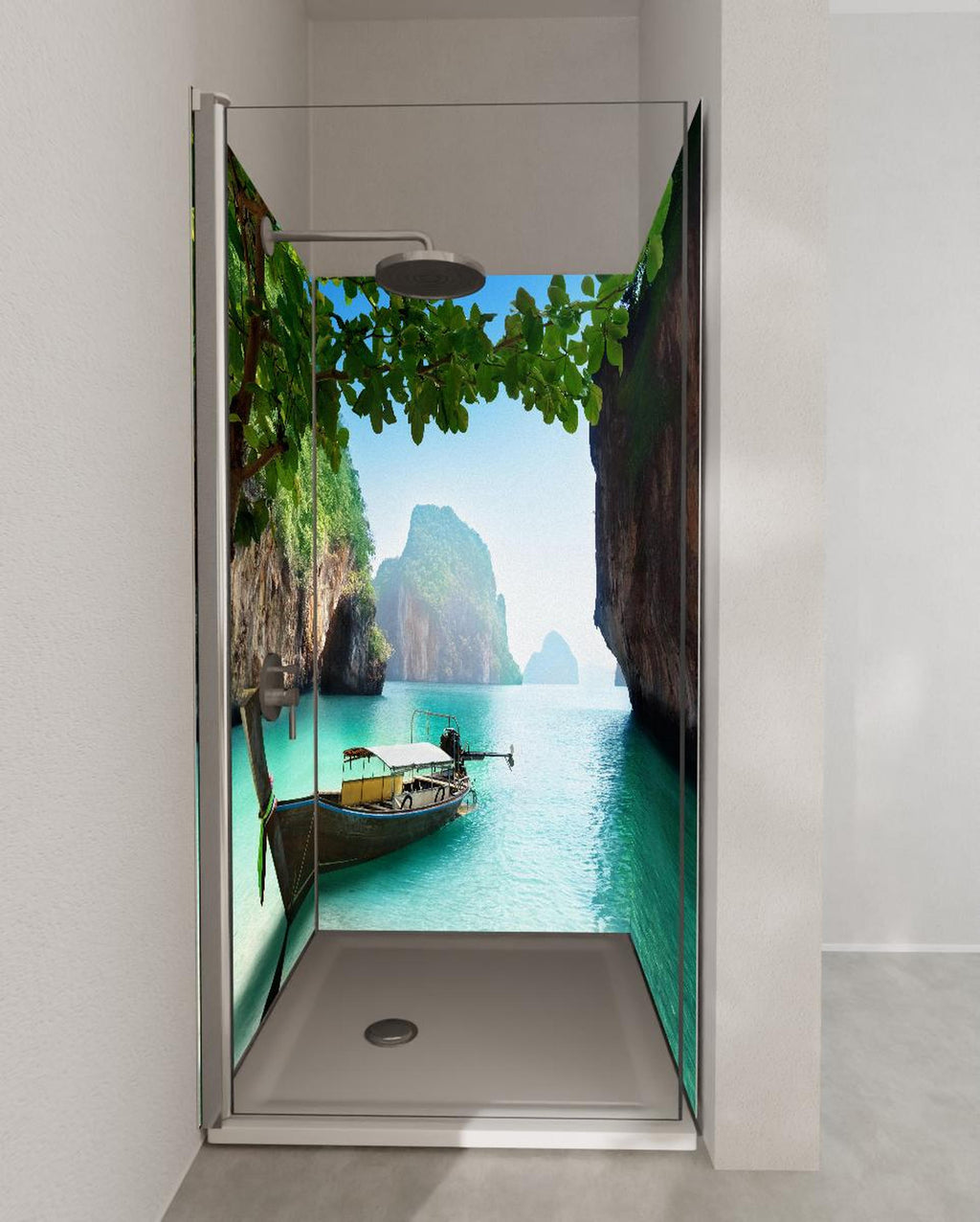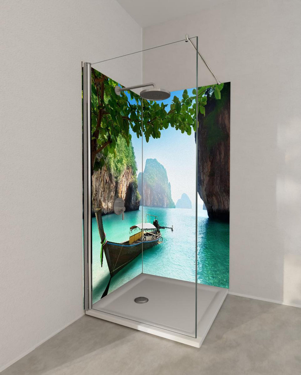 Duschrückwand - Boot auf kleiner Insel in Thailand