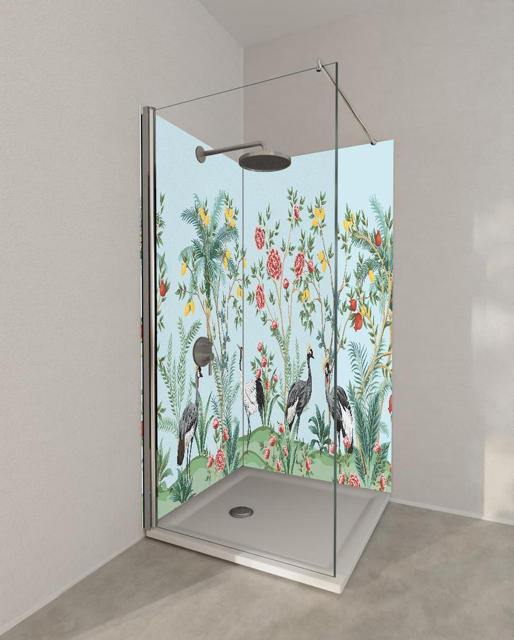 Duschrückwand - Botanische Tapete mit exotischen Vögeln
