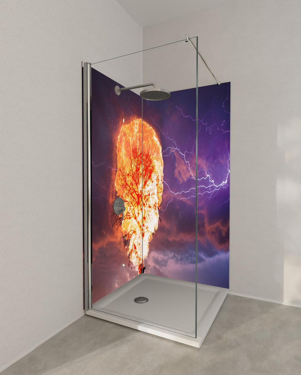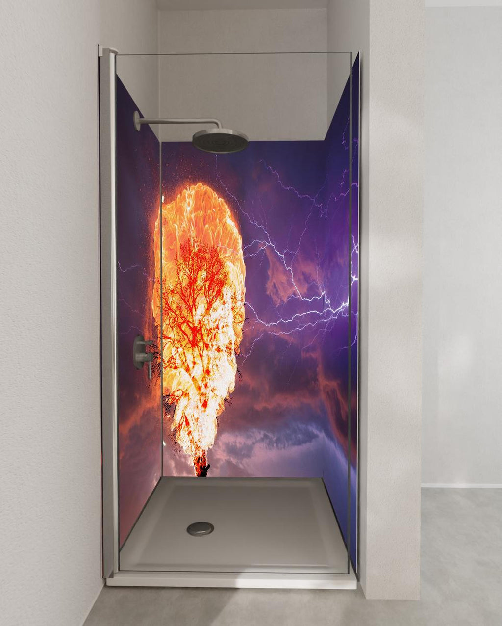 Duschrückwand - Brennender Baum bei Gewittersturm