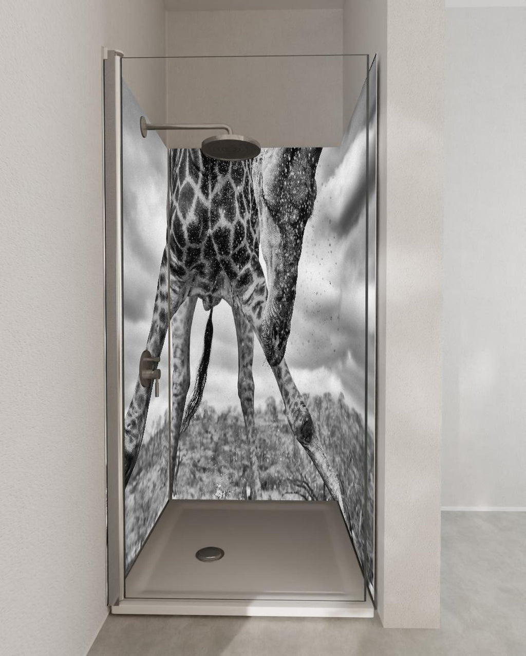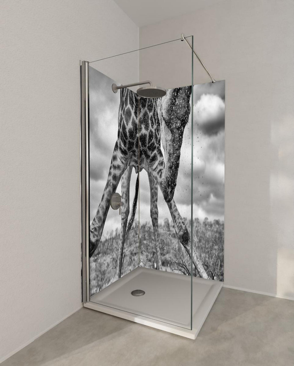 Duschrückwand - Dynamische Giraffe Schwarz-Weiß Momentaufnahme