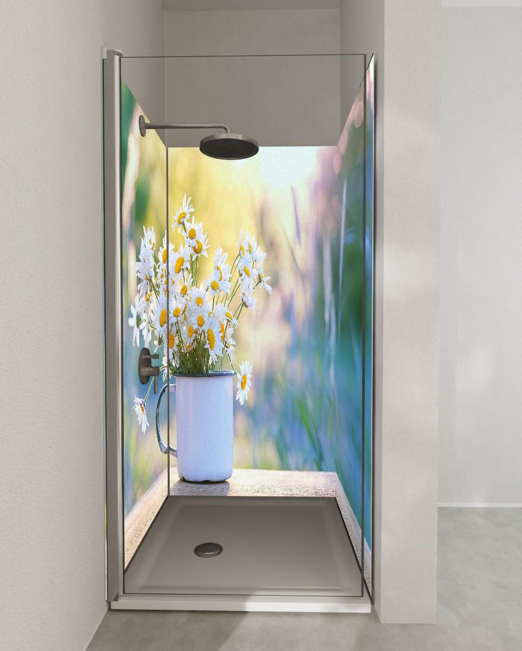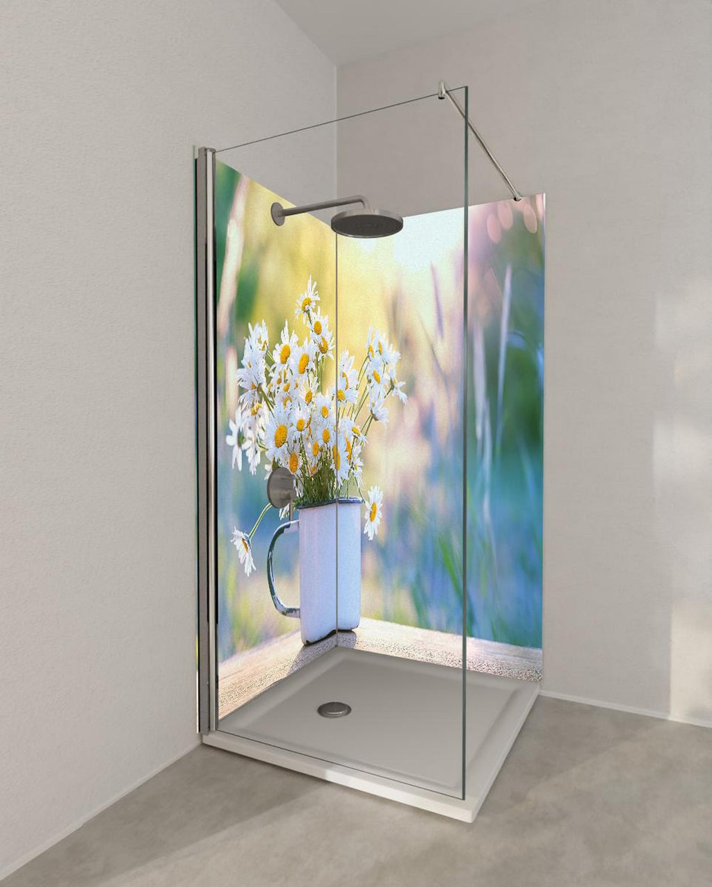 Duschrückwand - Gänseblümchen im Licht des Sonnenuntergangs