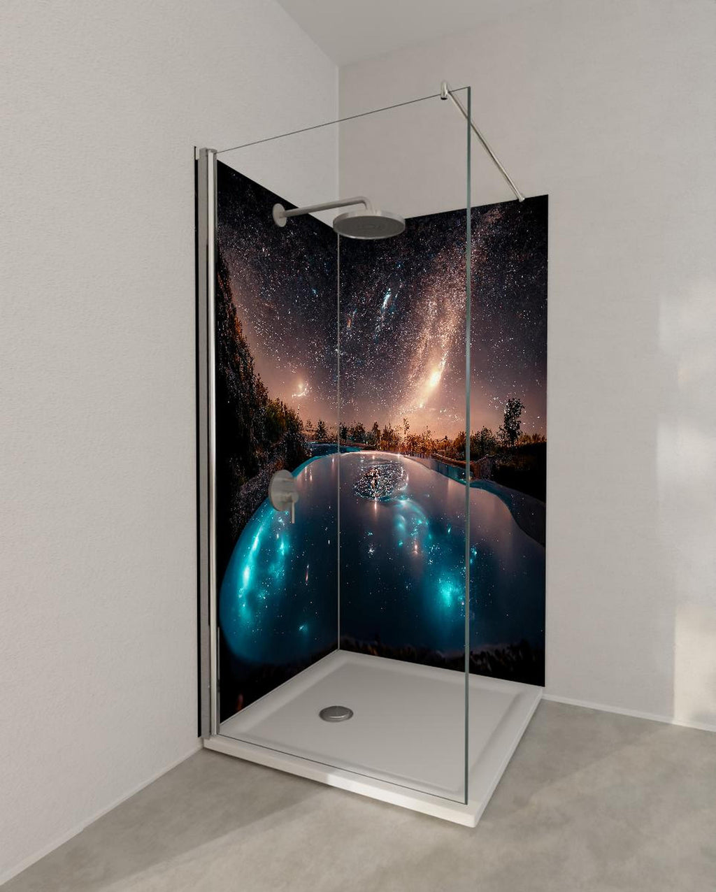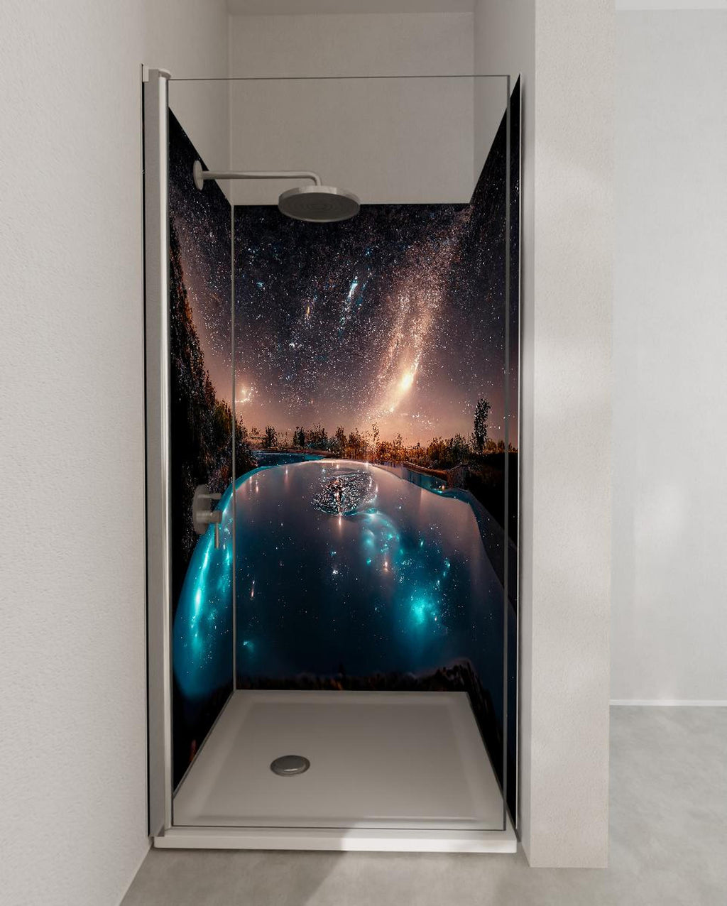 Duschrückwand - Galaktische Nacht Reflexion im See