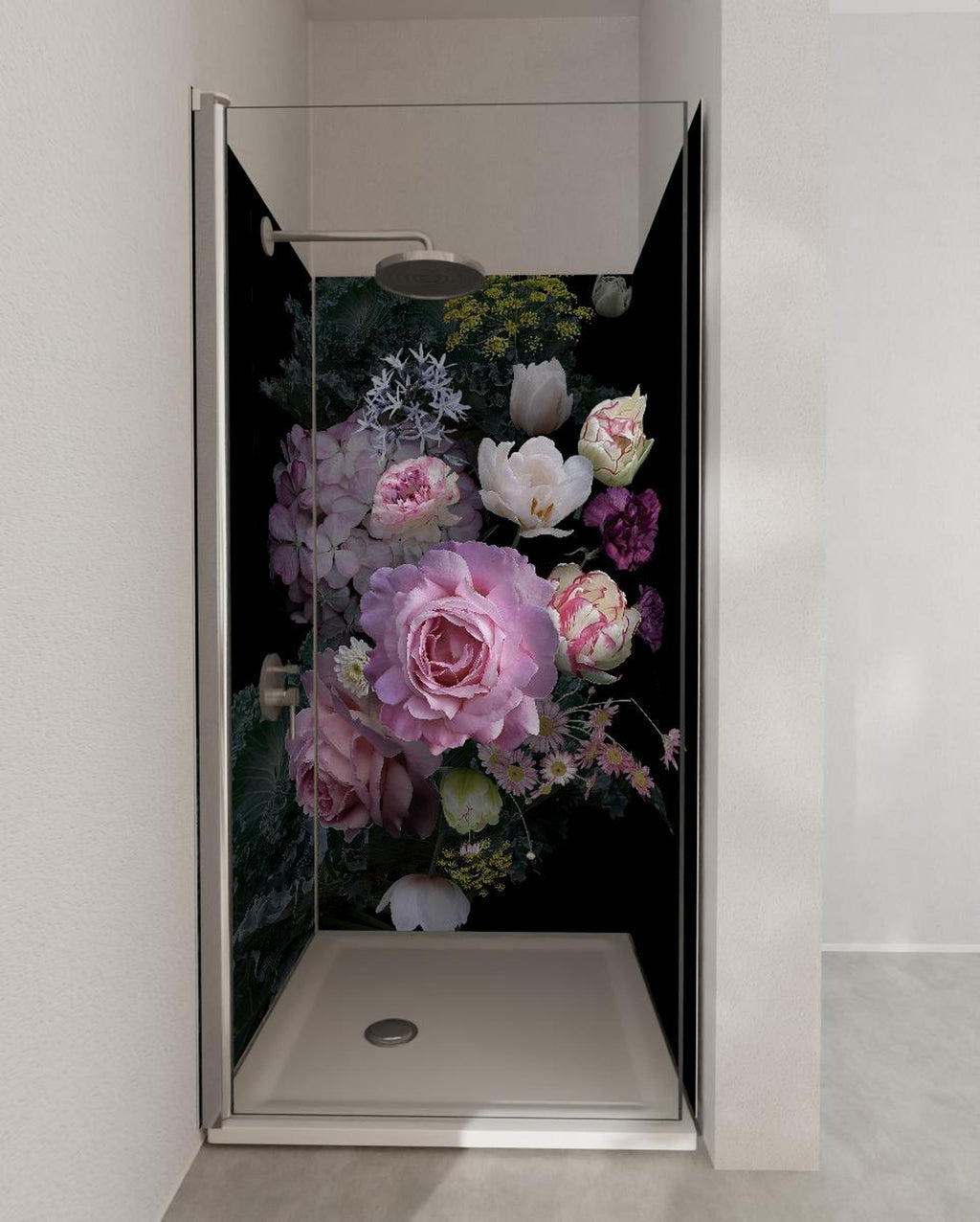 Duschrückwand - Garten Blumen mit dunklem Hintergrund