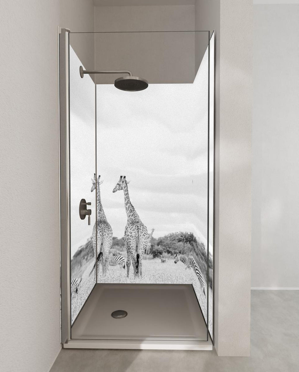 Duschrückwand - Giraffen und Zebras - schwarz-weiß