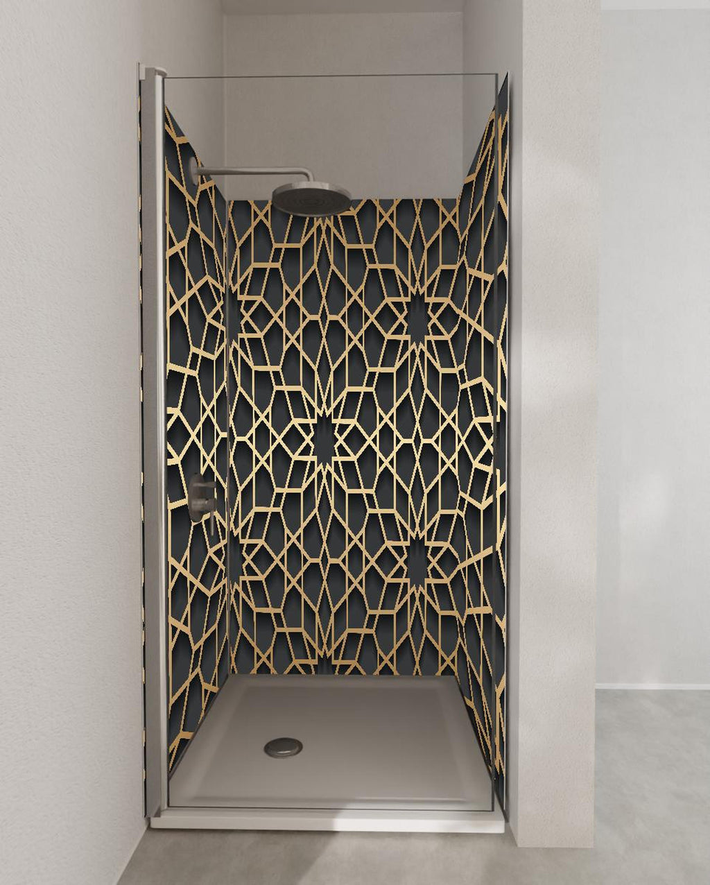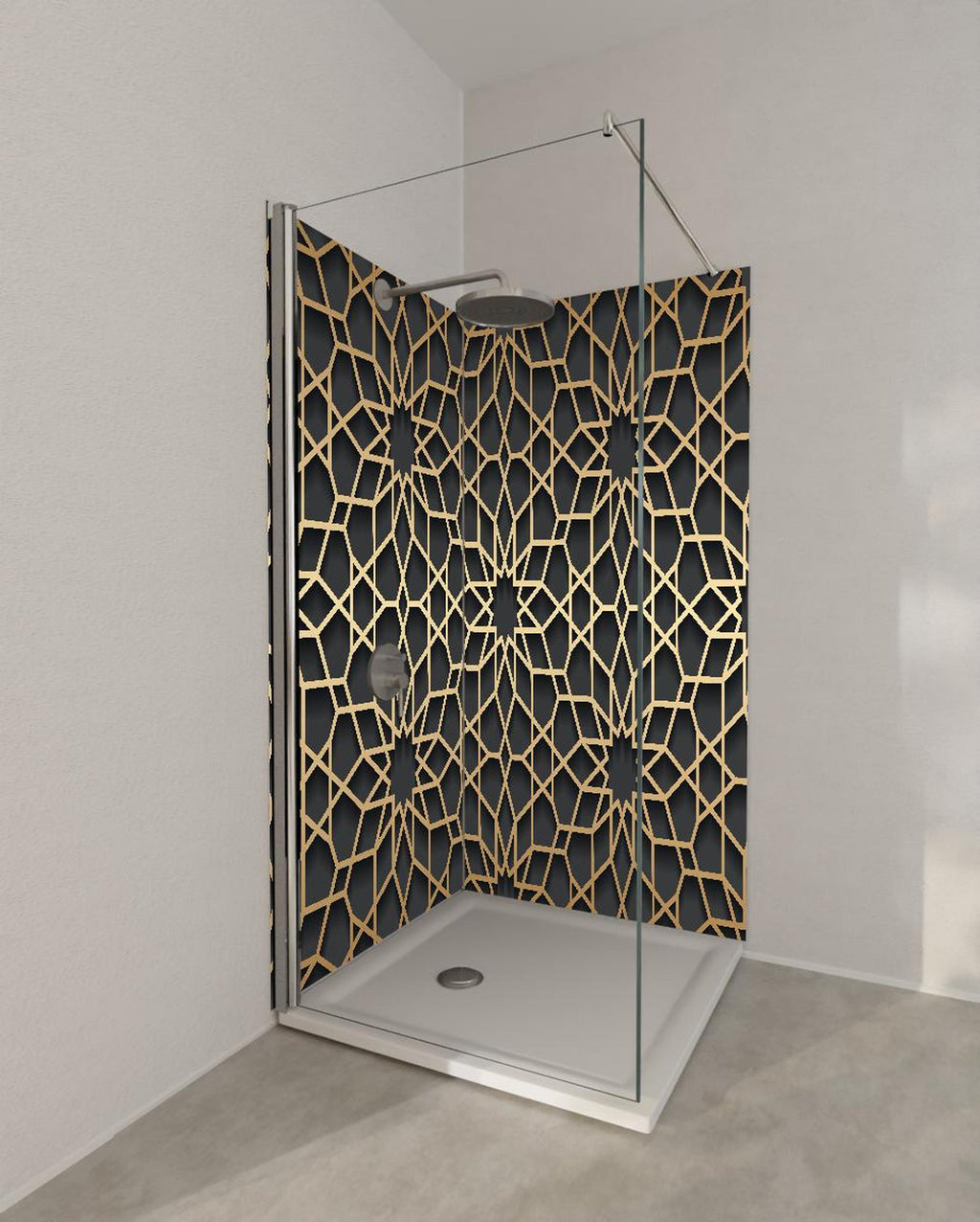 Duschrückwand - Goldenes Muster auf dunklem Hintergrund
