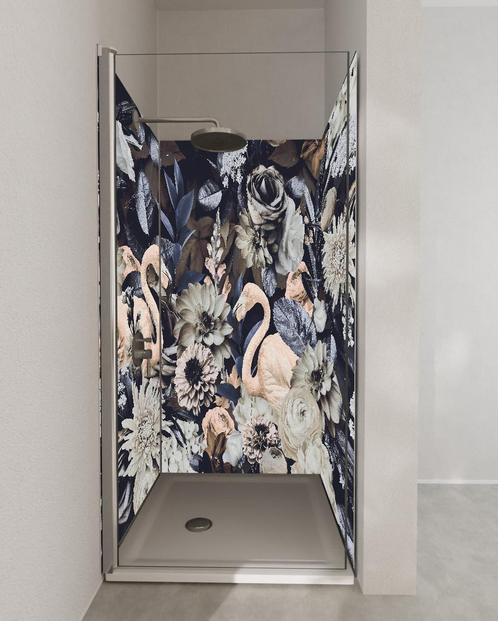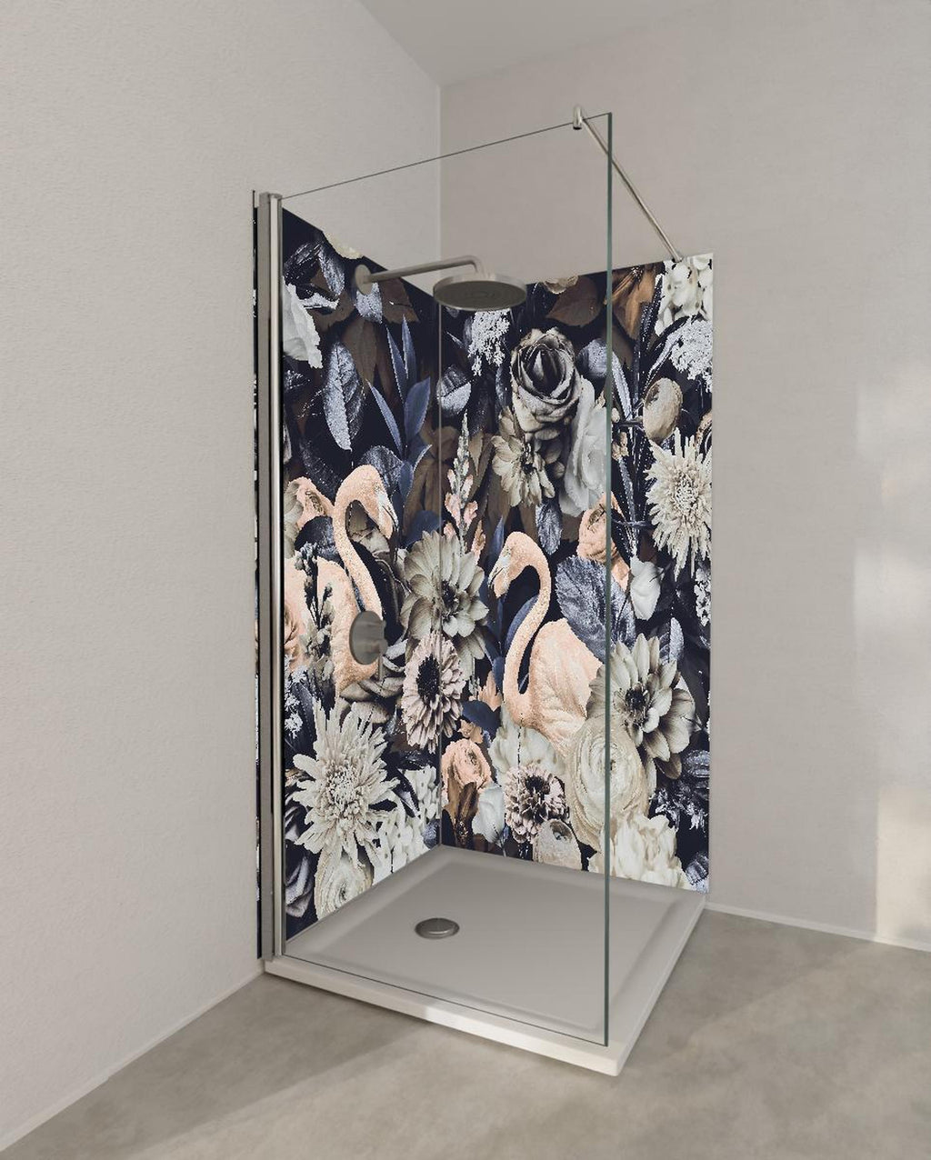 Duschrückwand - Grau-Weiße Flamingos im Blumenmeer