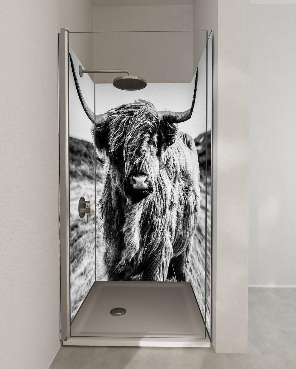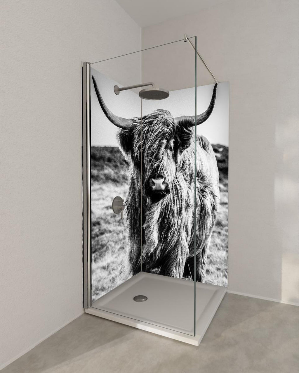 Duschrückwand - Hochlandkuh in Schwarz-weiß