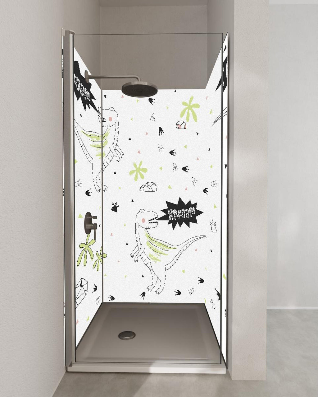 Duschrückwand - Kinder Dino Cartoon Muster in Weiß-Grün