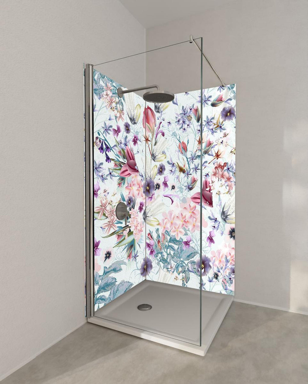 Duschrückwand - Lebendiges Blumenmuster auf Textilhintergrund
