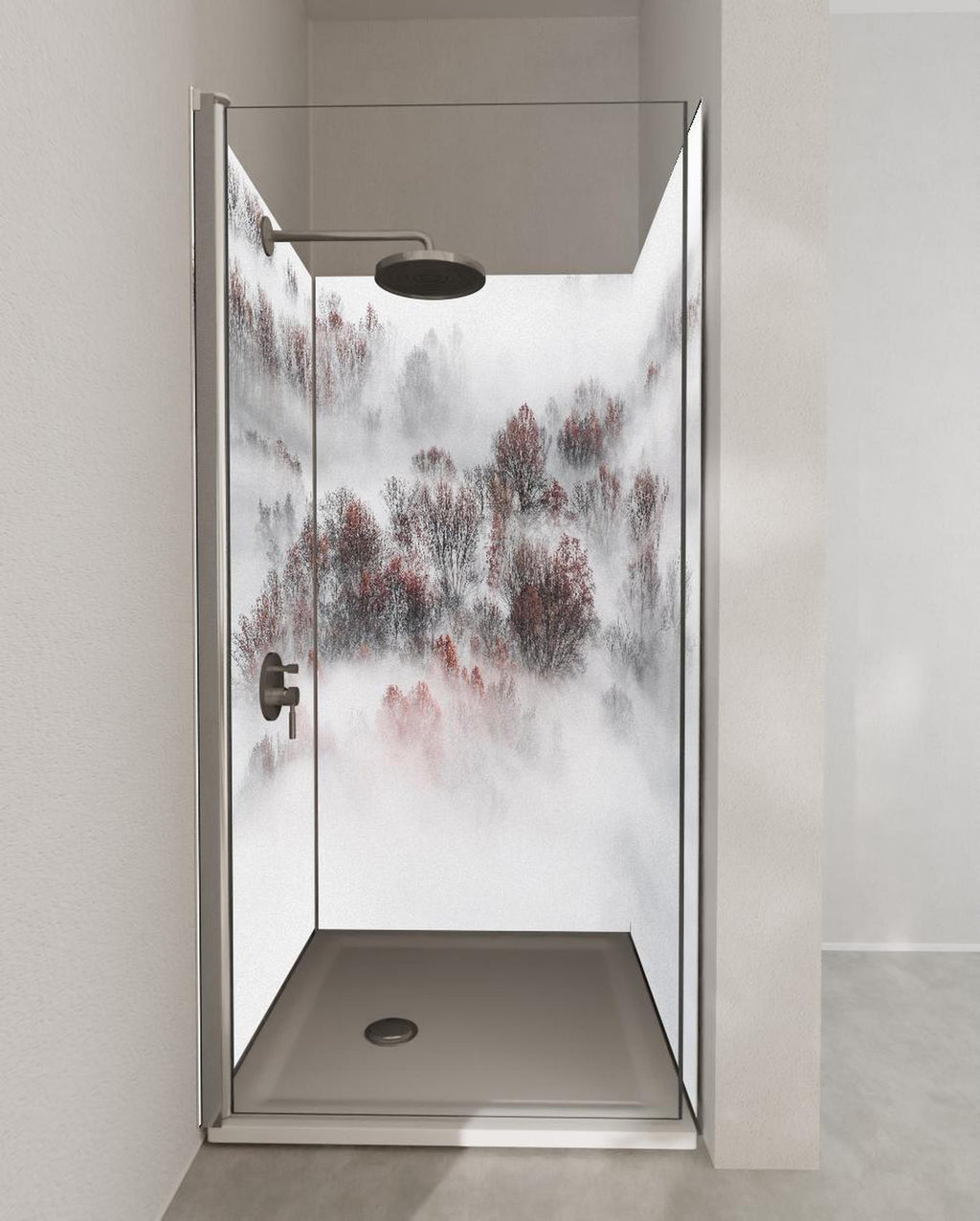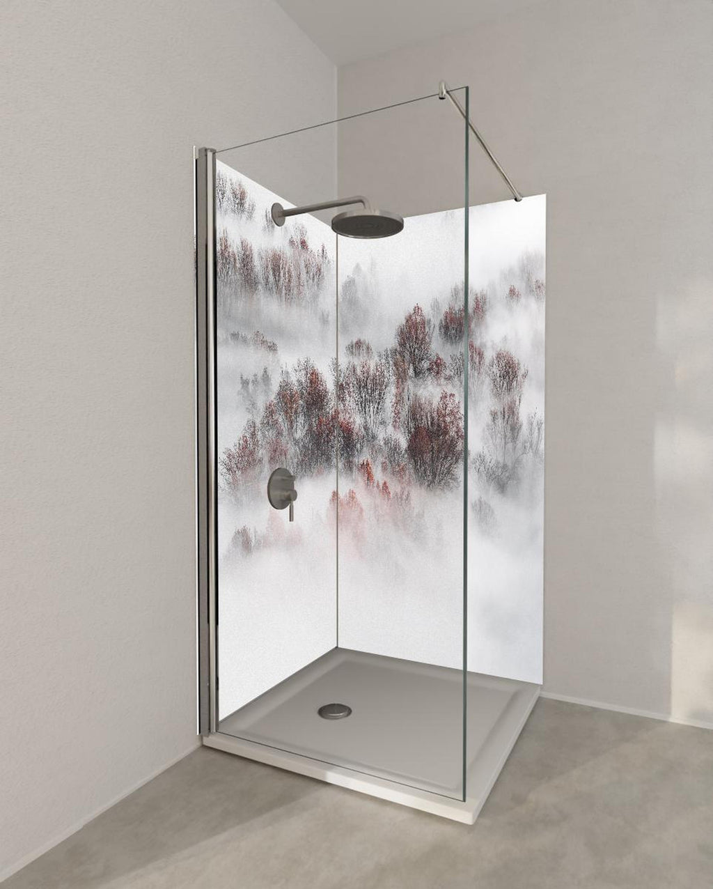 Duschrückwand - Mystischer Weiß-Grauer Nebelwald