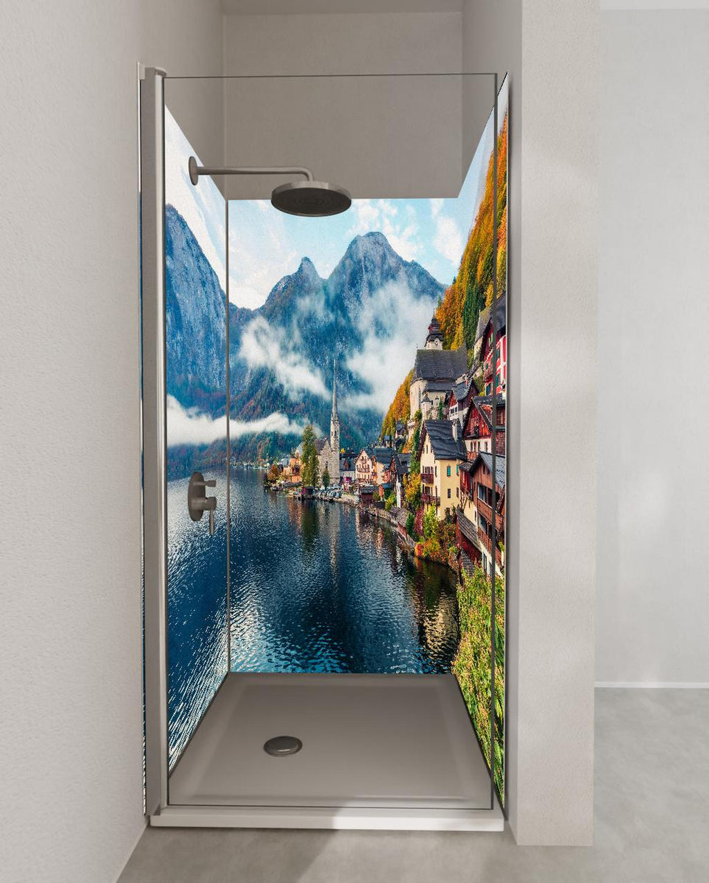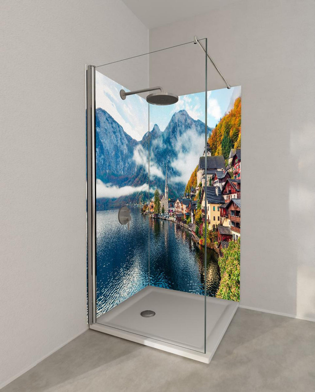 Duschrückwand - Neblige Herbstszene am Hallstätter See