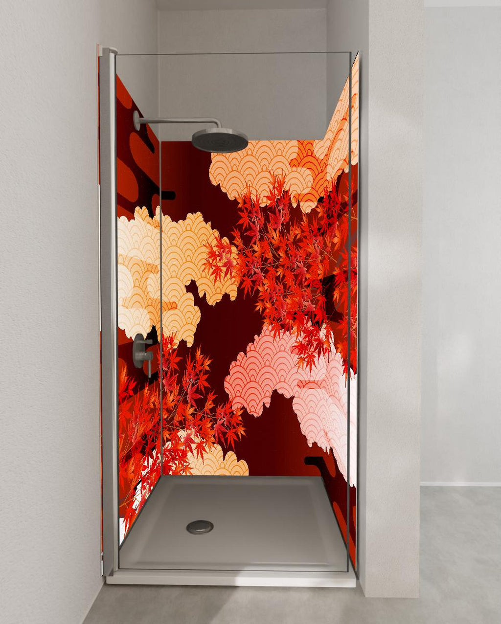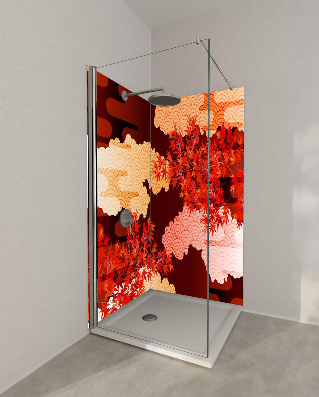 Duschrückwand - Rote Ahornblätter mit Wolkenmuster