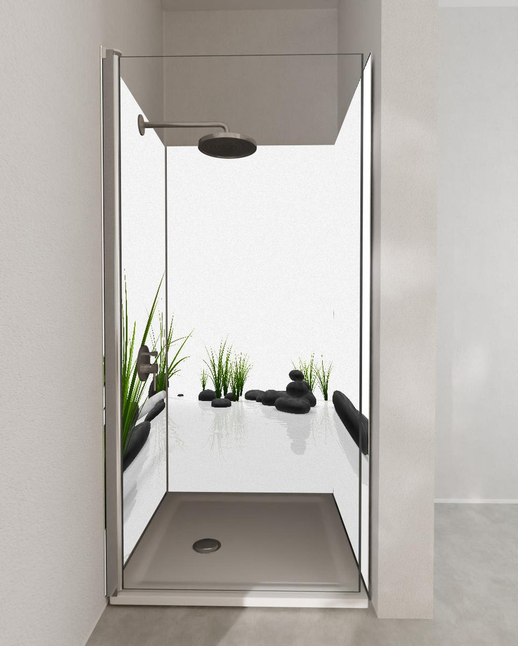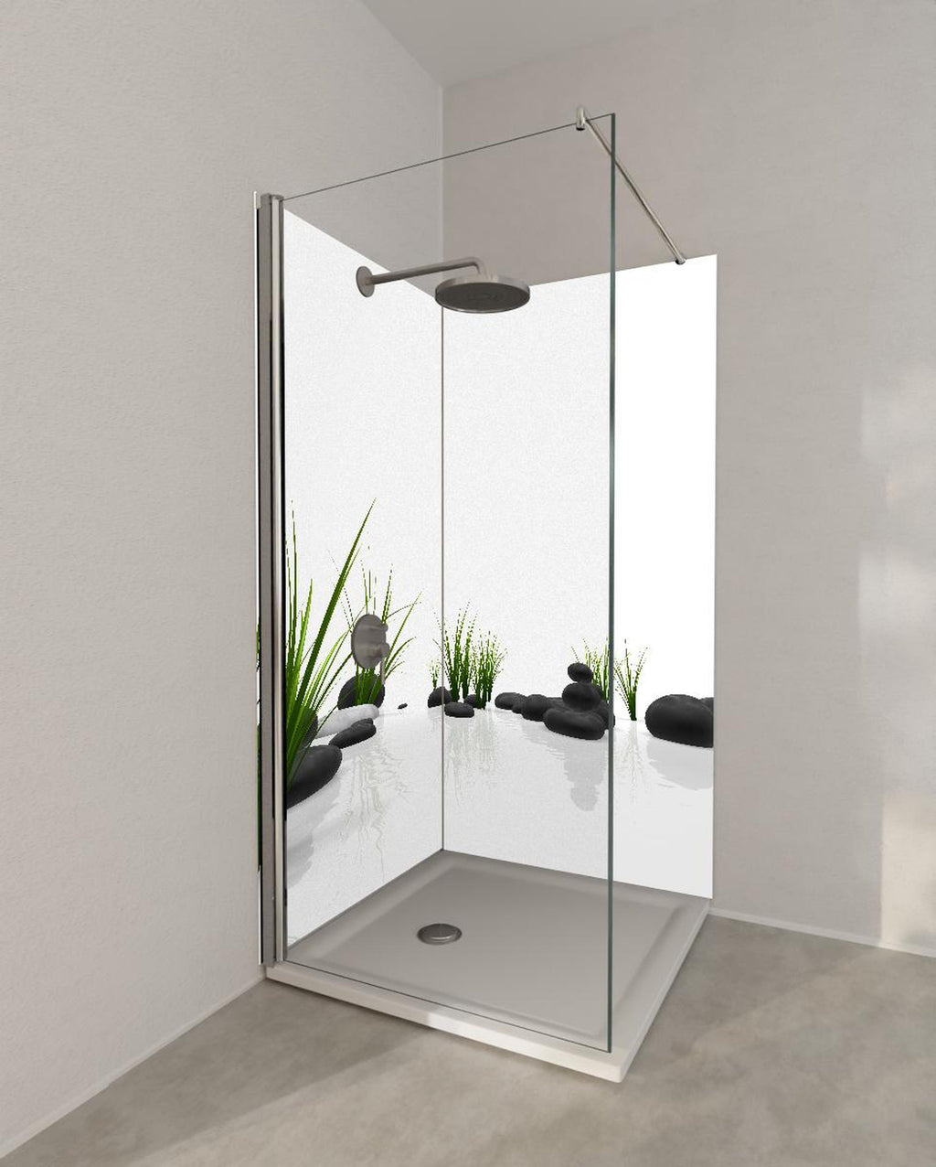Duschrückwand - Ruhiges Steine Gefilde mit Gras und Wasser