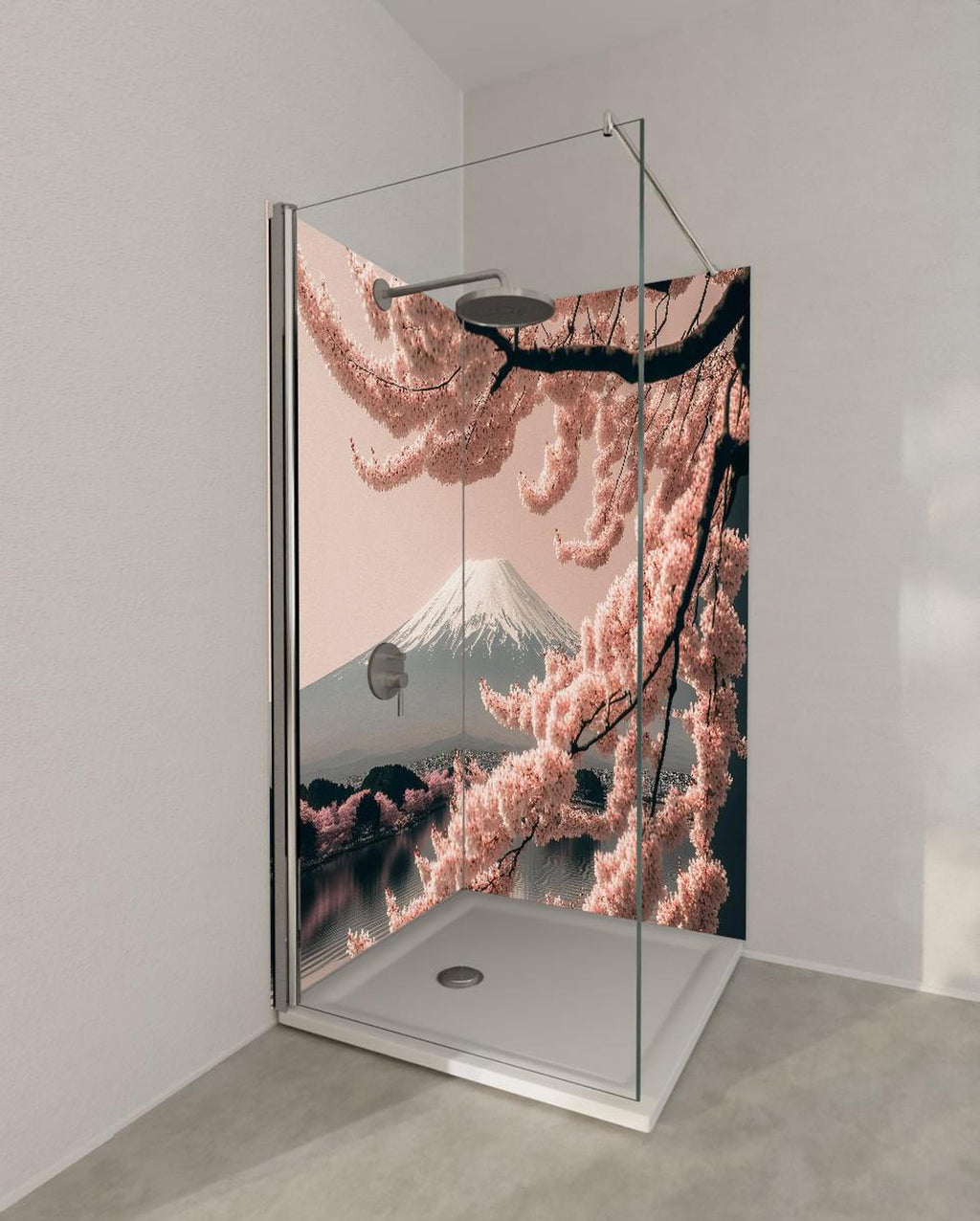 Duschrückwand - Sakura Baum mit Fuji Berg im Hintergrund