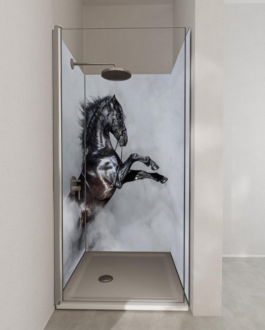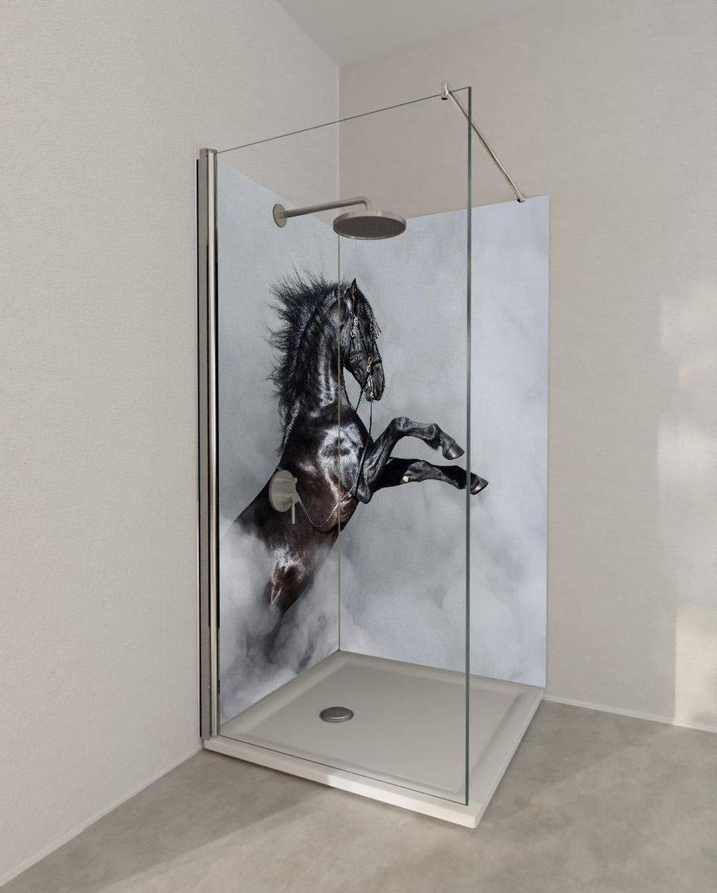 Duschrückwand - Schwarzes Andalusier Pferd im Nebel