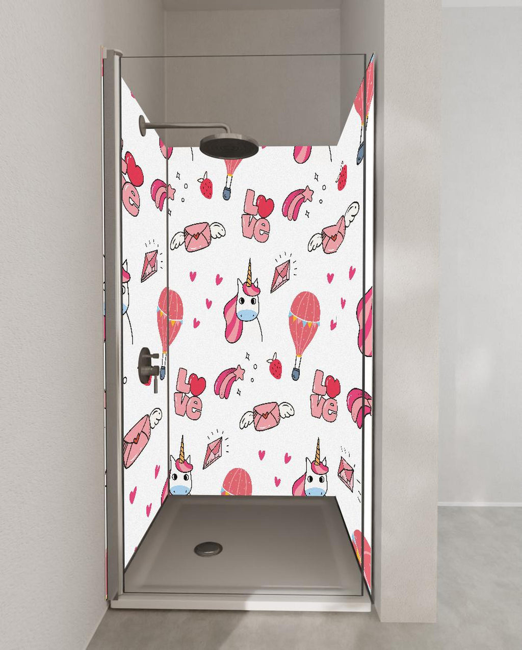 Duschrückwand - Verspieltes Einhorn und Herz Musterdesign