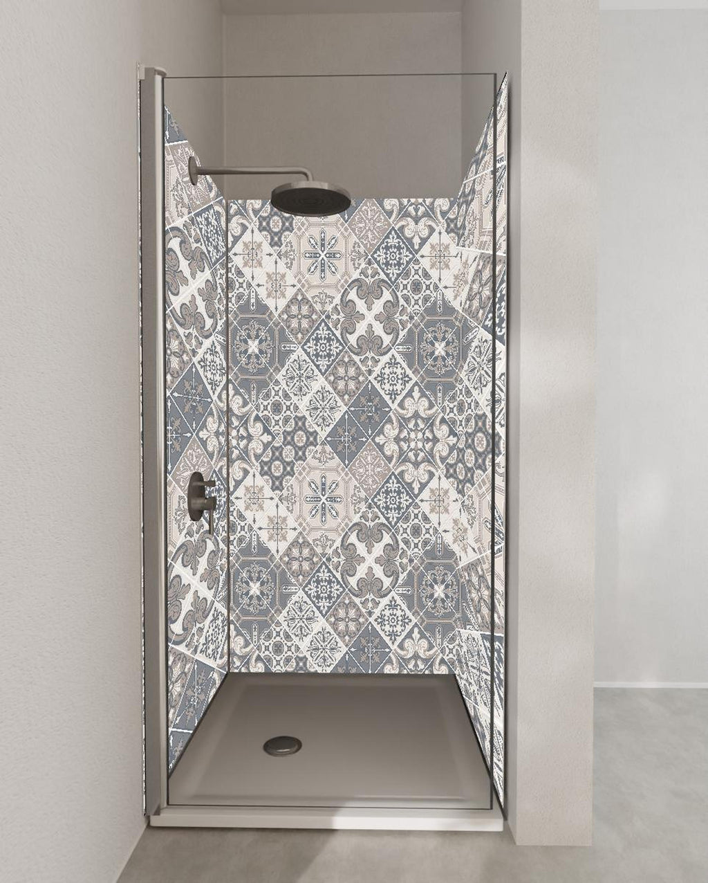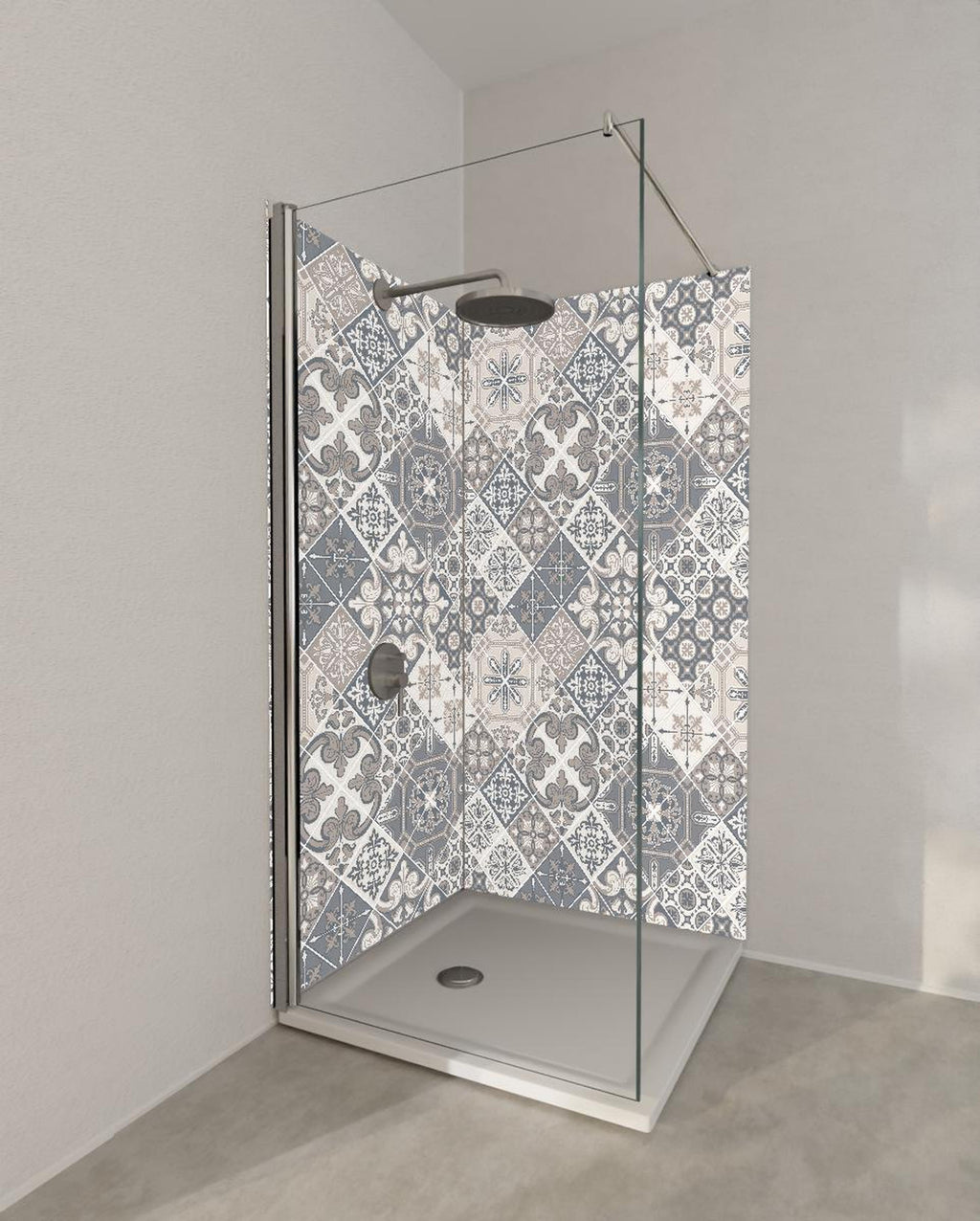 Duschrückwand - Vintage Fliesenmuster in Grau und Weiß