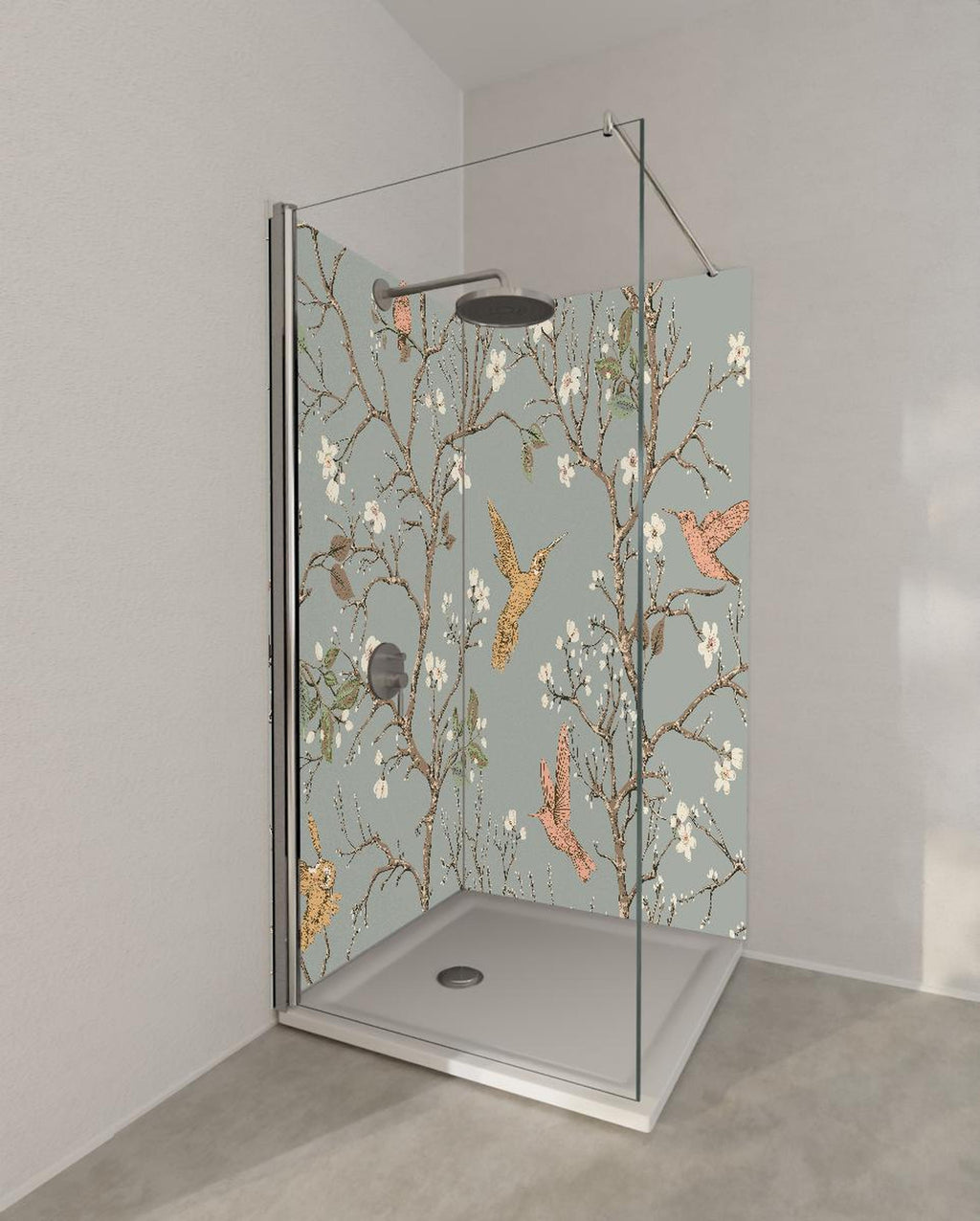 Duschrückwand - Vogelmotiv Blumenzweige auf Grau