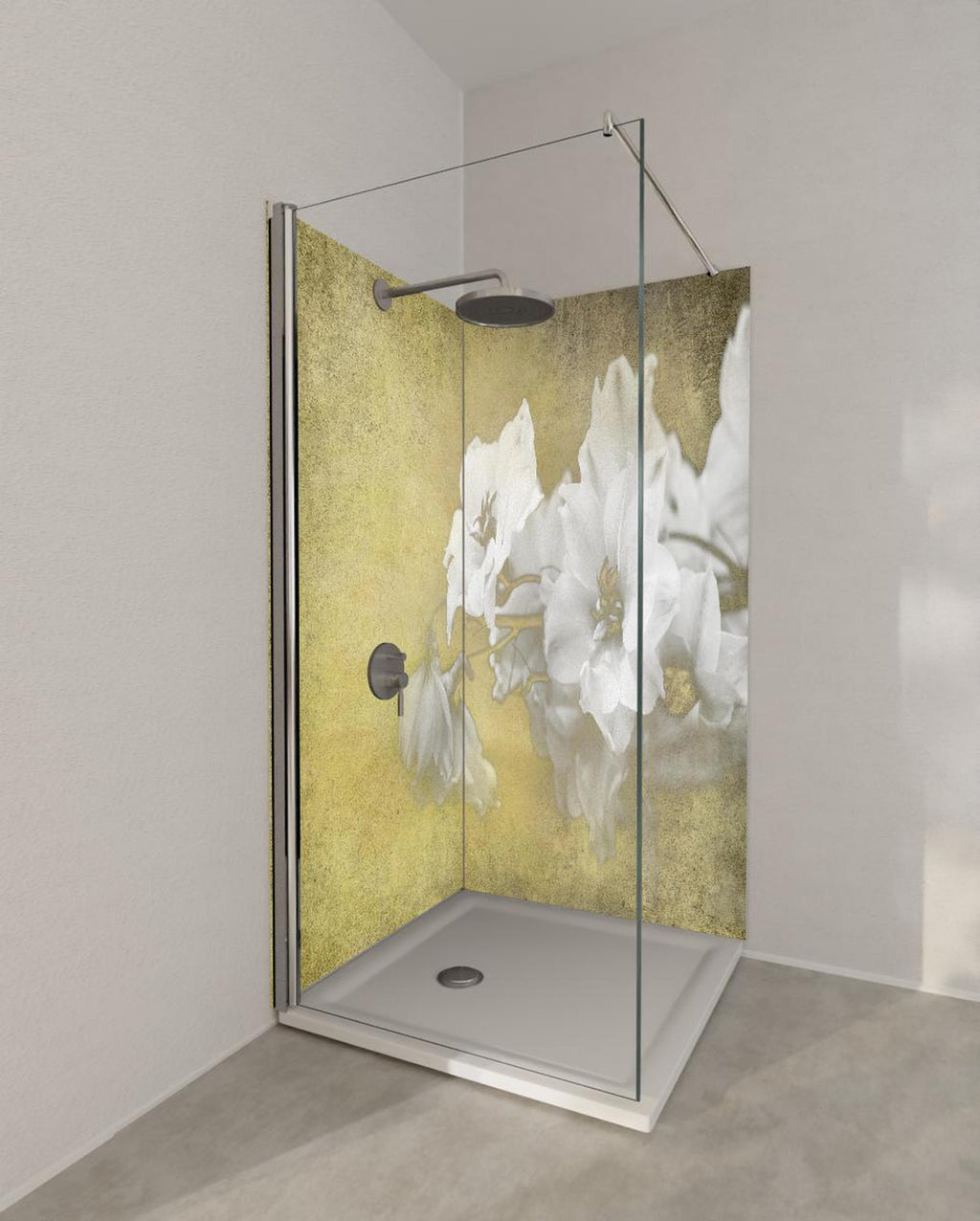 Duschrückwand - weiße Blumen auf goldenem Hintergrund