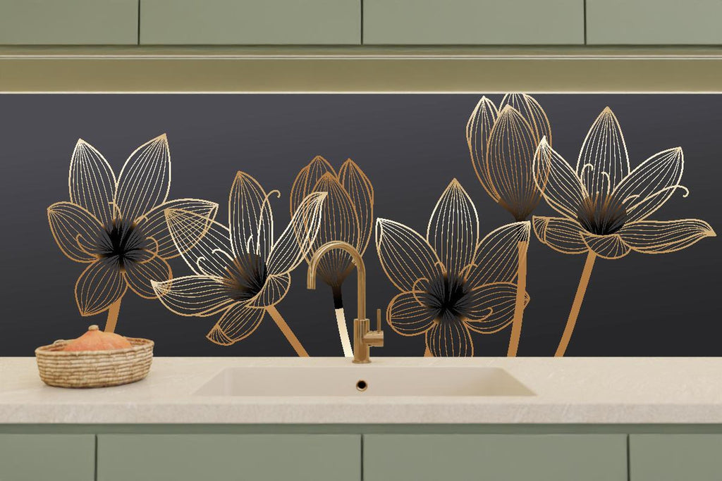 Küchenrückwand - Abstrakte Blumen Gold Schwarz Design