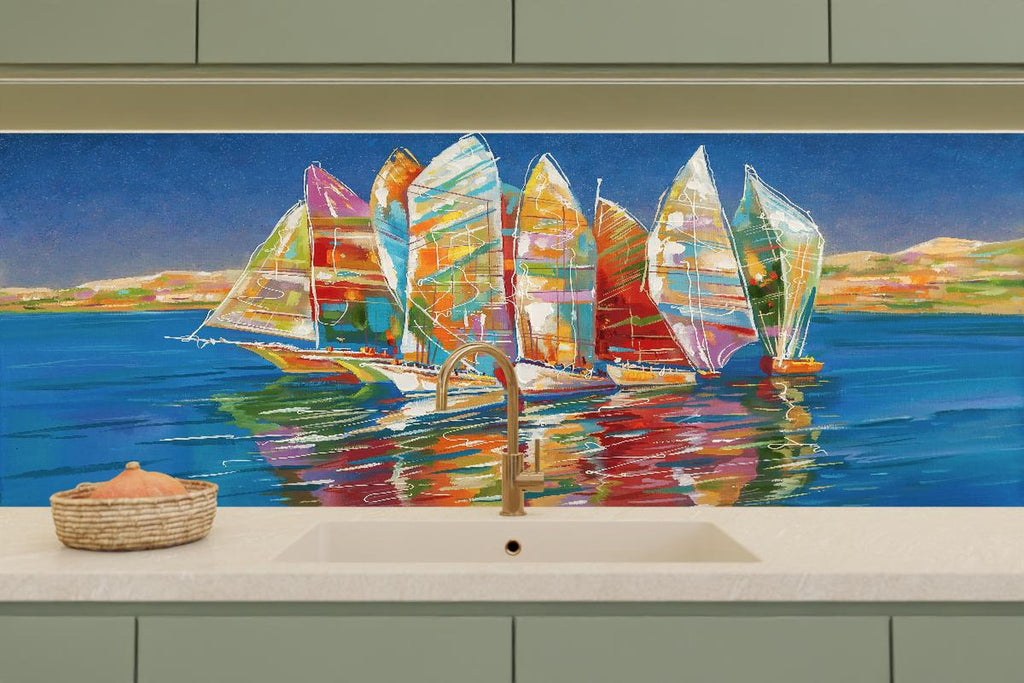 Küchenrückwand - Bunte Boote auf dem Meer - Ölgemälde