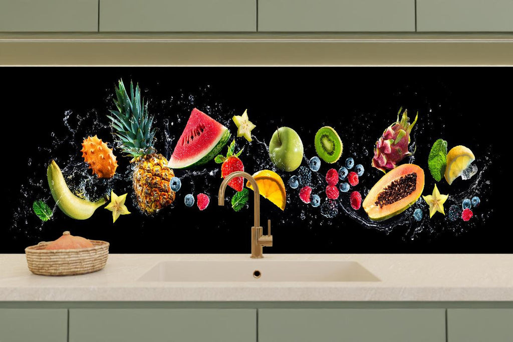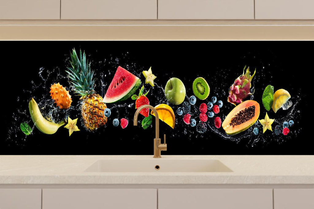 Küchenrückwand - Bunte Früchte mit Wasserspritzern