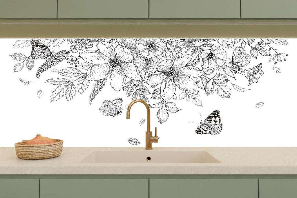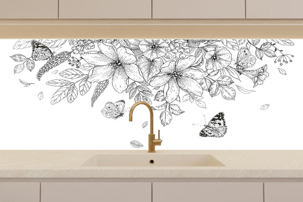 Küchenrückwand - Detailreiche Blumen-Zeichnung in Schwarz-Weiß