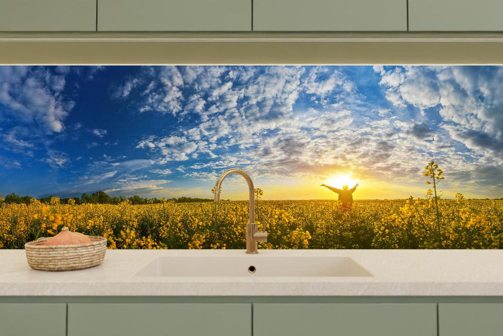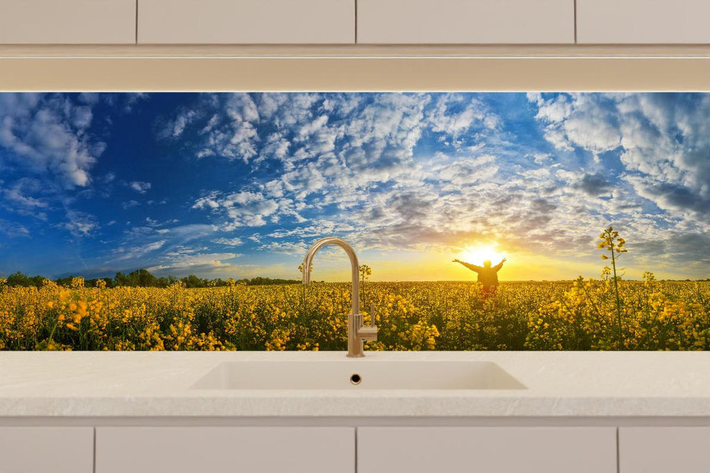 Küchenrückwand - Gelbliches Blumenfeld am Morgen