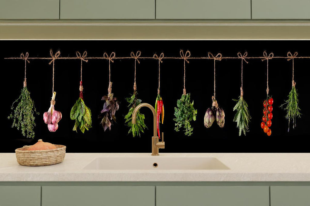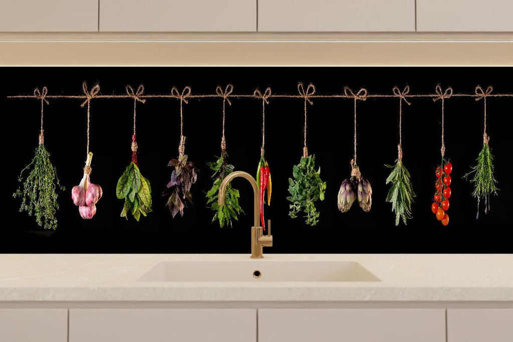 Küchenrückwand - Gemüse & Kräuter aufgehängt