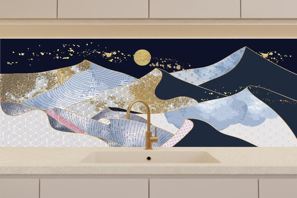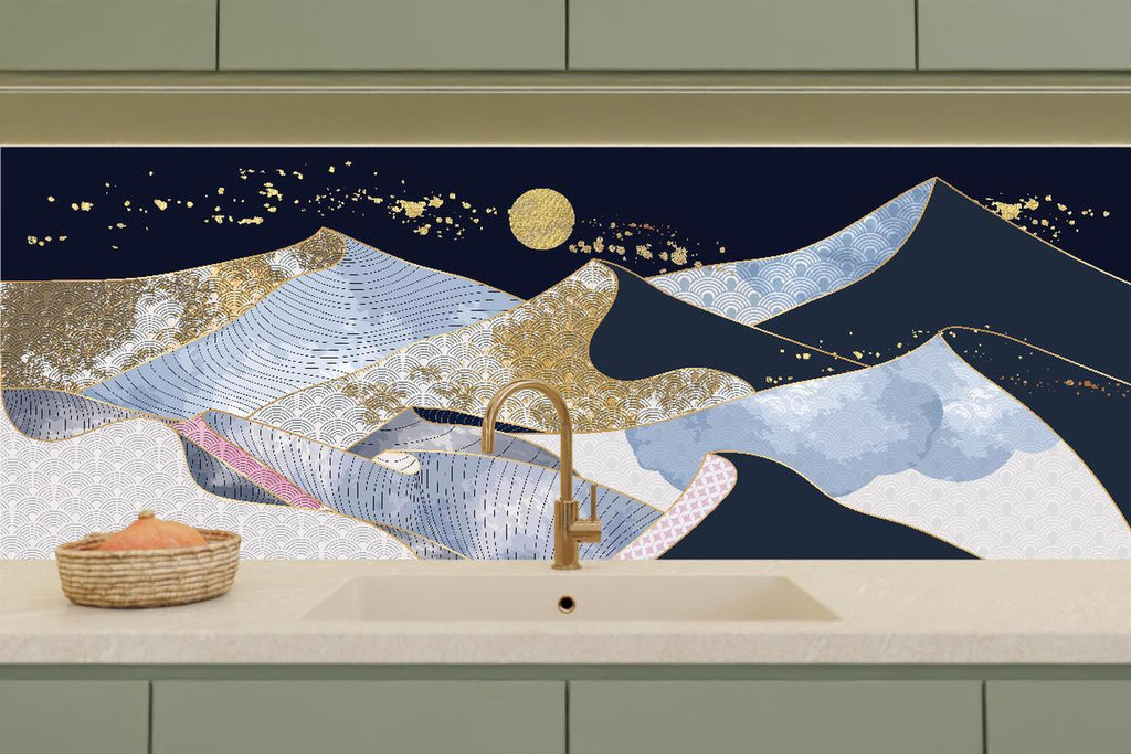Küchenrückwand - Goldener Mond über blaugrauer Abstraktlandschaft