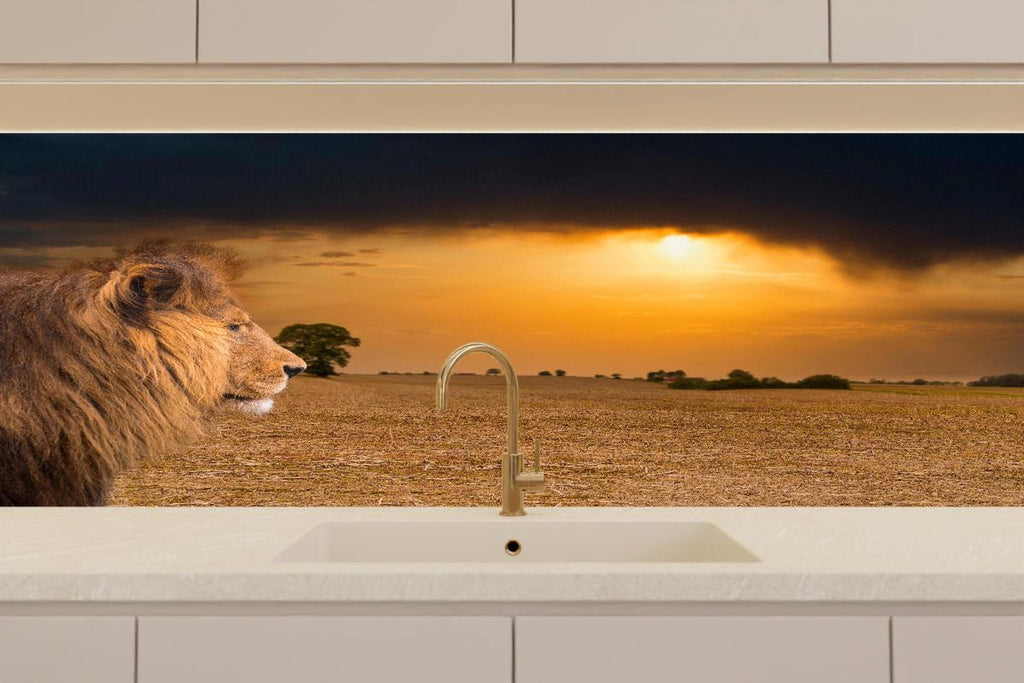 Küchenrückwand - Löwe in Steppe im Sonnenuntergang