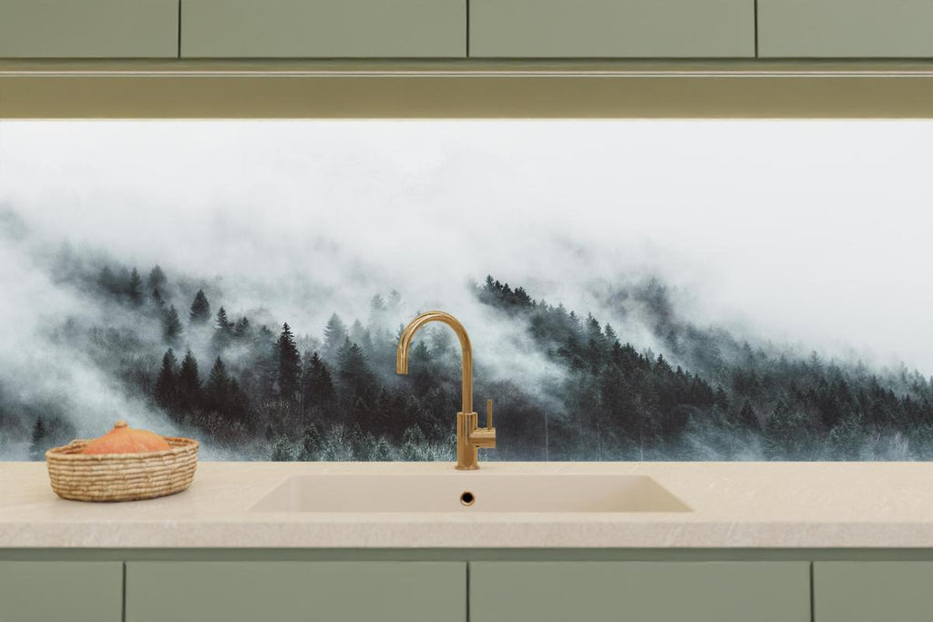 Küchenrückwand - Mystischer Nebelwald in Grau-Weiß Nuancen