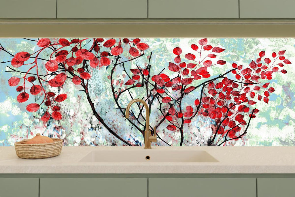 Küchenrückwand - Ölmalerei von roten Blättern im Frühling