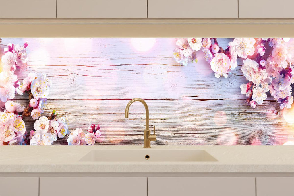 Küchenrückwand - Rosa Blüten auf Holzplatte
