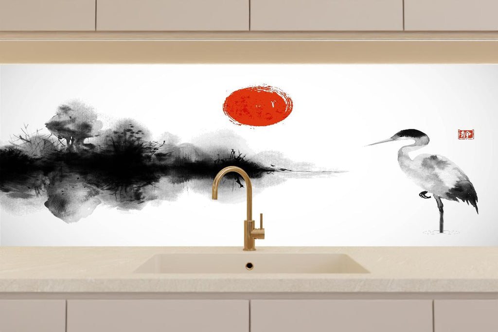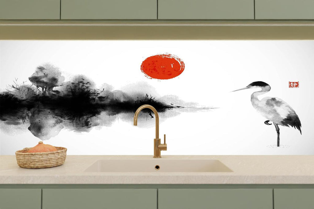 Küchenrückwand - Schwarz-Weiße Kranich Zeichnung mit Rot