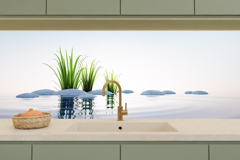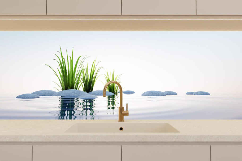 Küchenrückwand - Steine und Gras im See Querformat