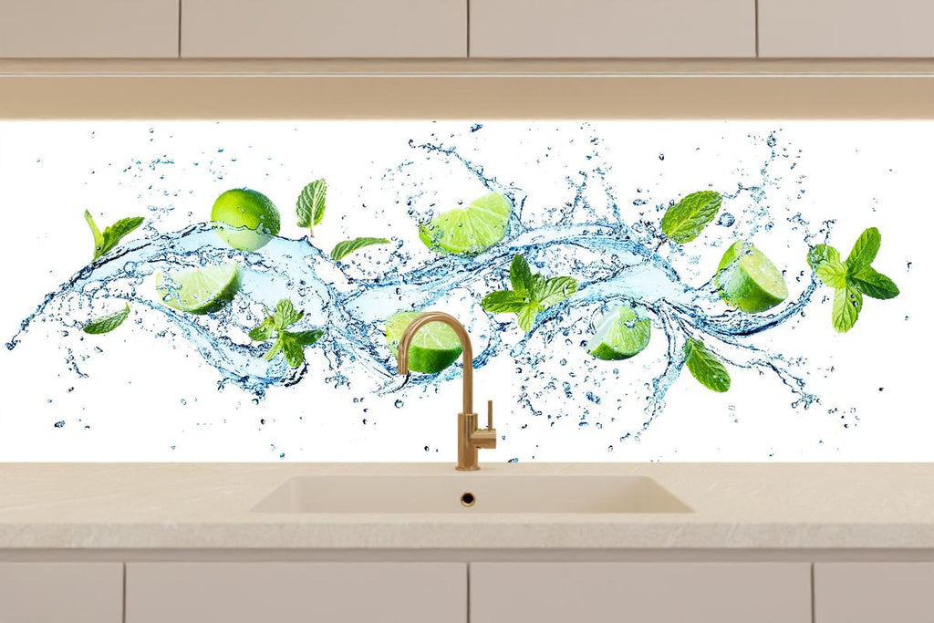 Küchenrückwand - Wasserspritzer mit Minzblättern und Limettenspalten
