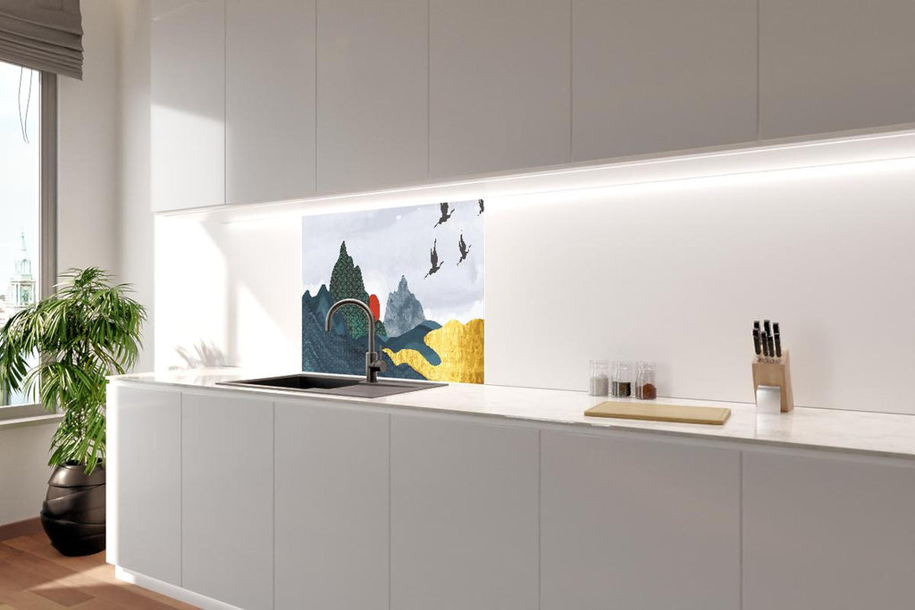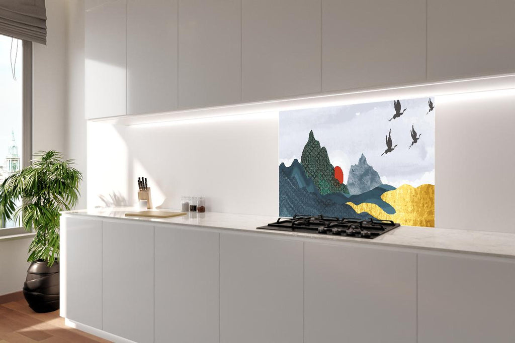 Spritzschutz - Abstrakte Berge und Vögel im Sonnenuntergang