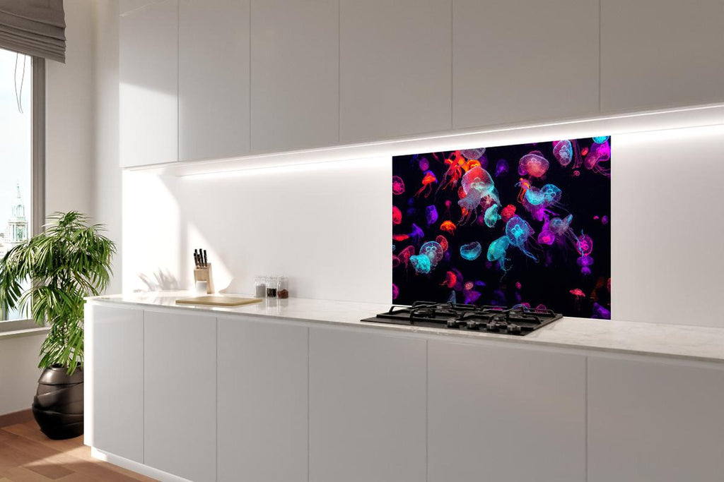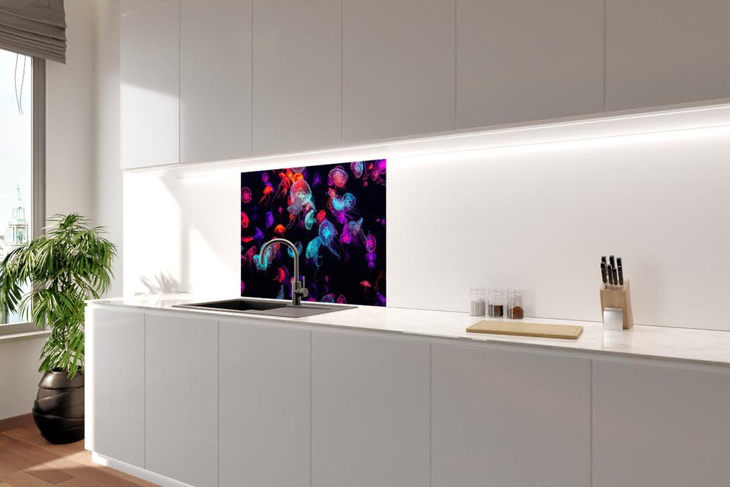 Spritzschutz - Bunt strahlende Quallen unter Wasser