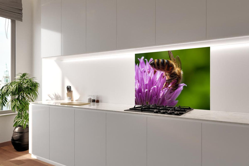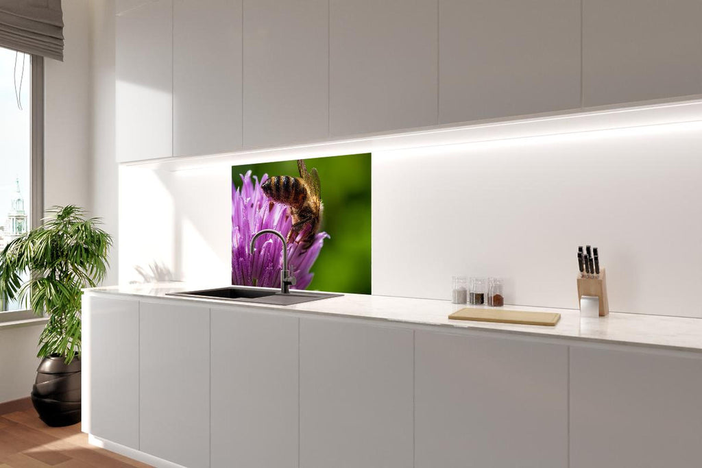 Spritzschutz - Detailreiche Makroaufnahme Biene Lila Blüte