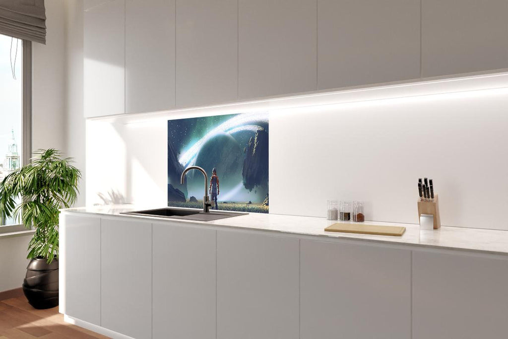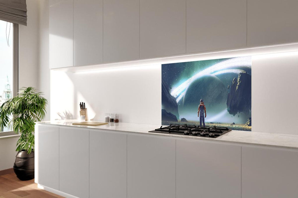Spritzschutz - Kosmischer Astronaut beim Planetenblick